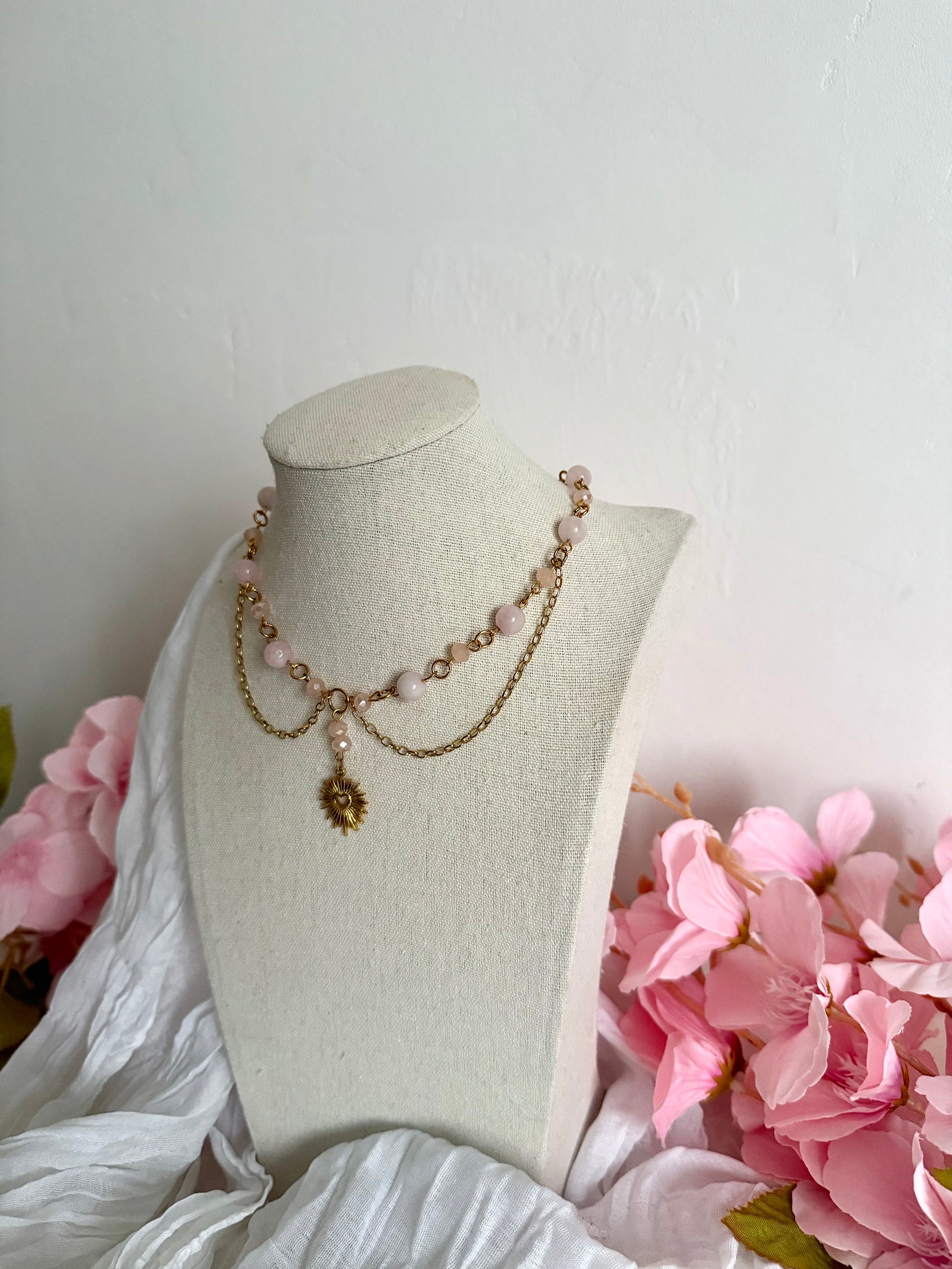 Imaginé dans l’univers du Jardin des Ladies, ce collier allie perles de verre rosées, perles de quartz et acier inoxydable pour un éclat naturel et raffiné.