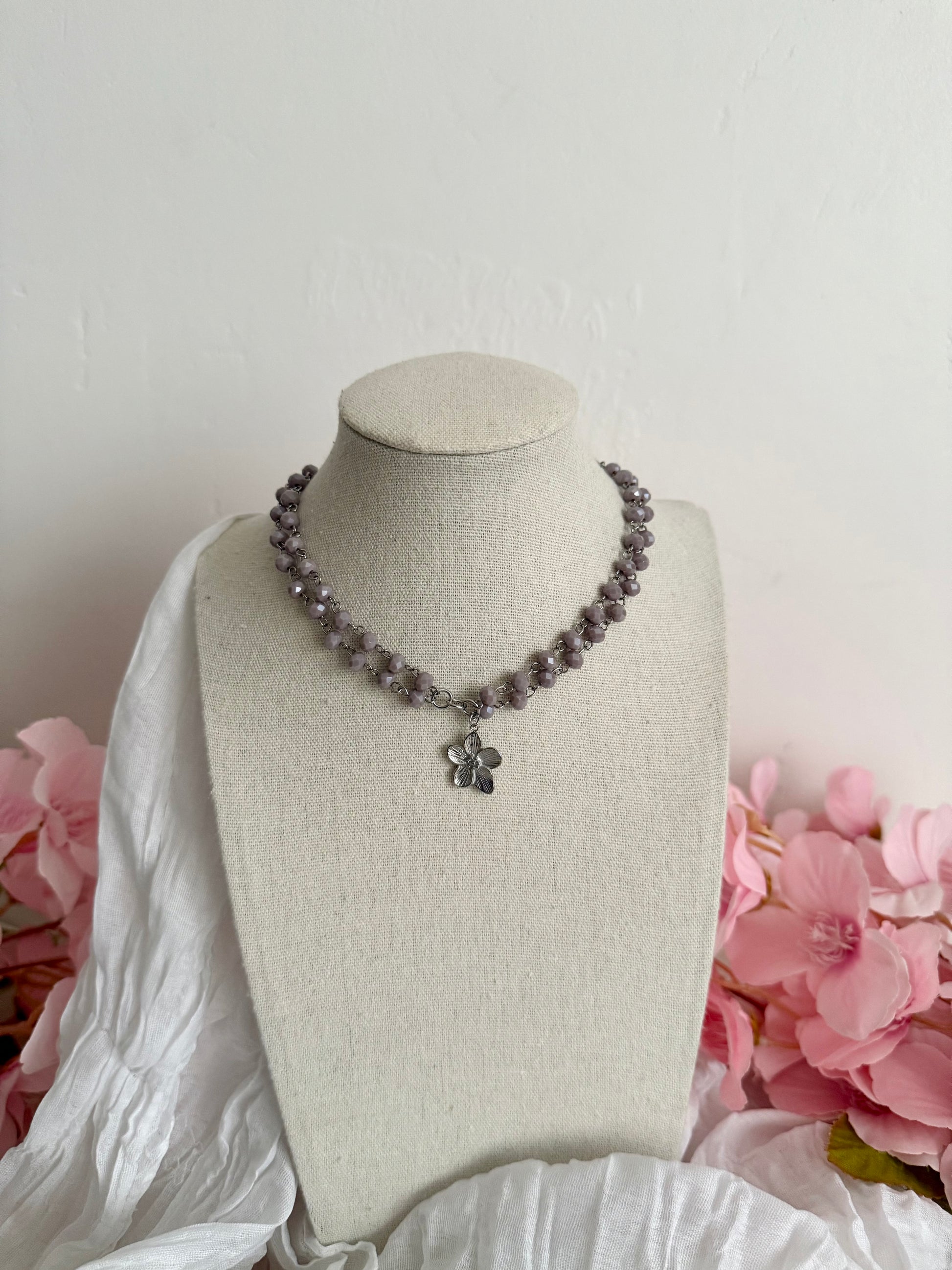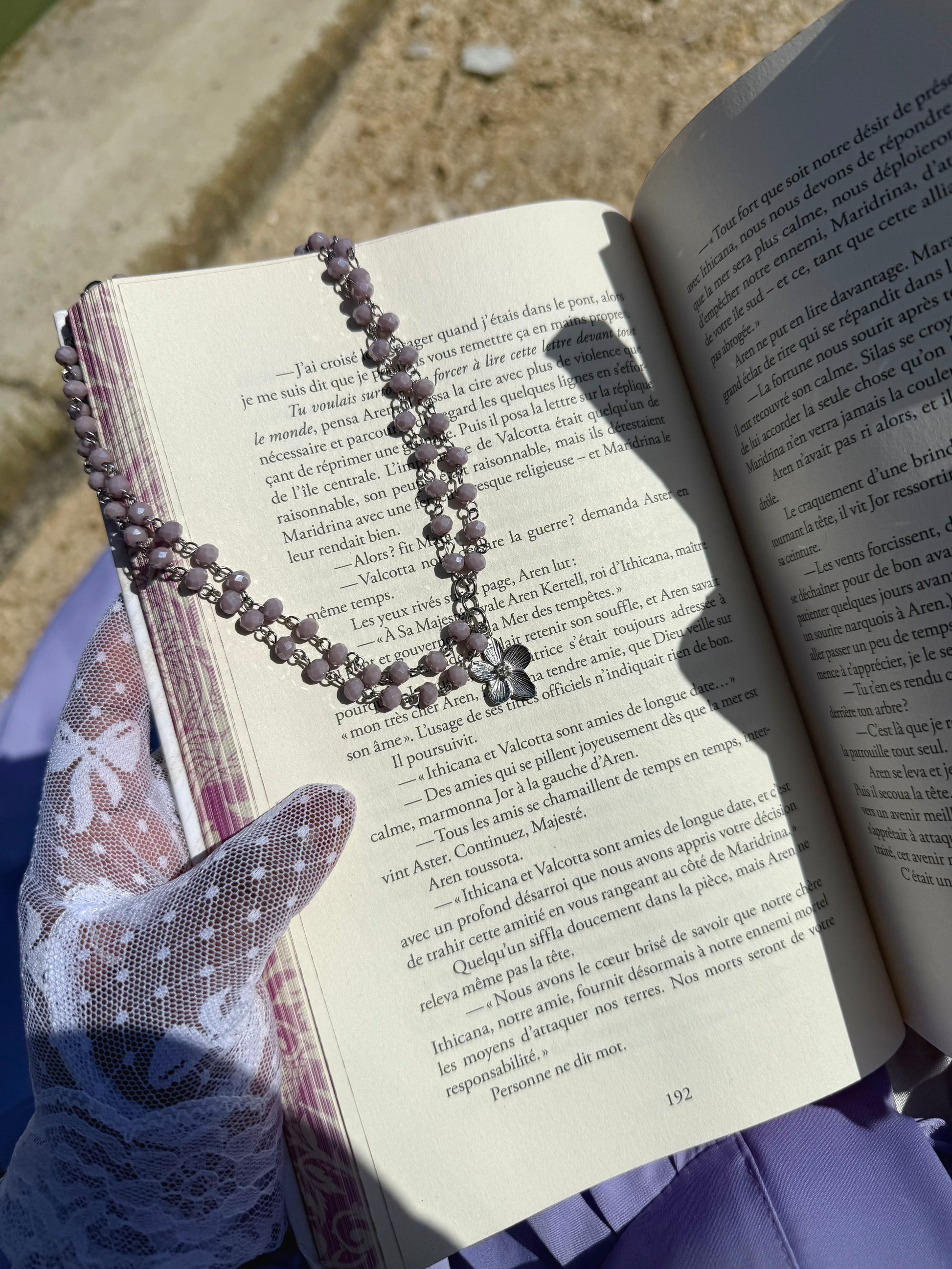 Pour cette création, je me suis inspirée de la fleur aux pétales d’or. À la place des chaînes classiques, j’ai choisi deux rangs de perles en verre violettes, inspirées de la couleur de sa robe.
