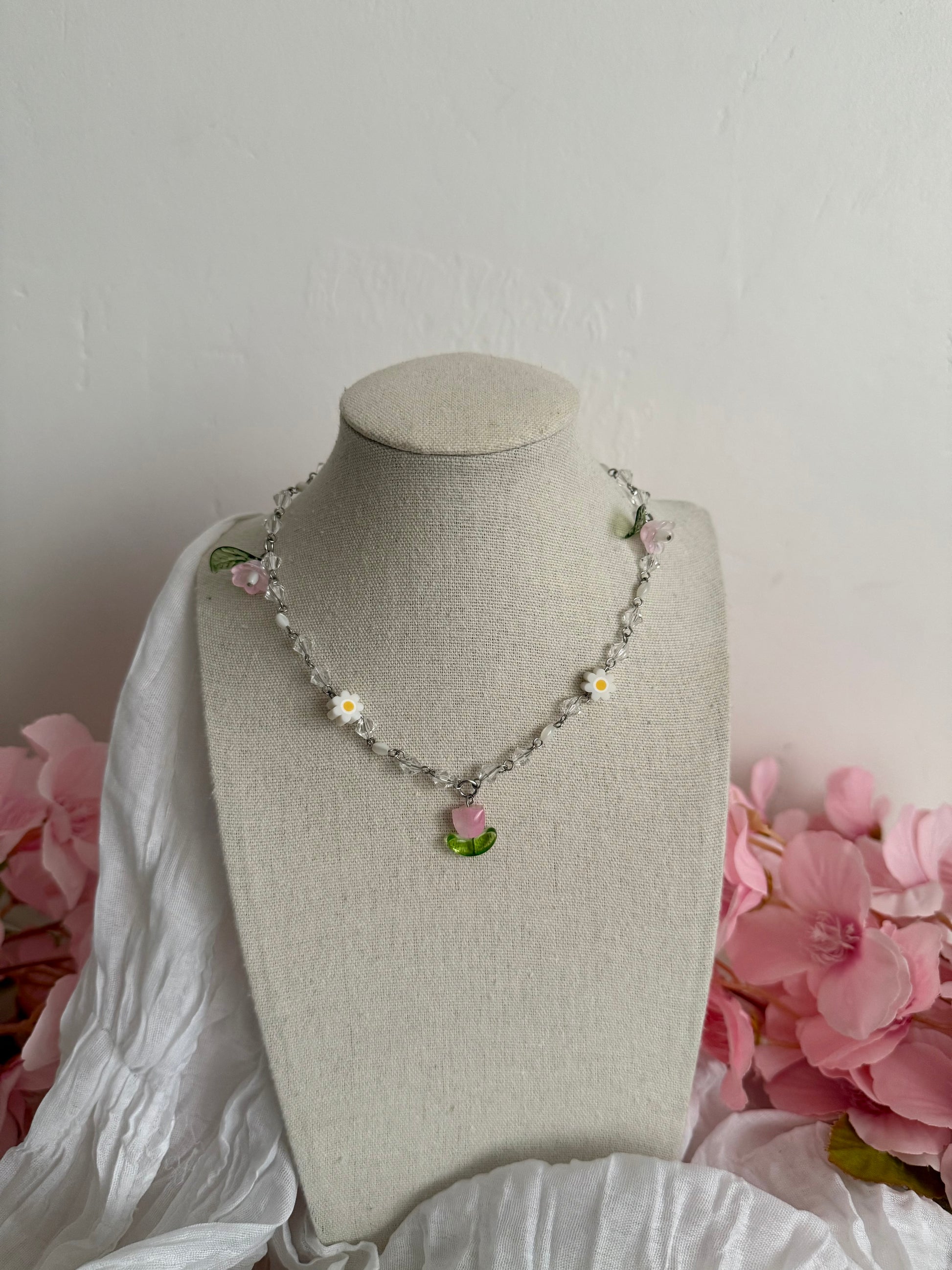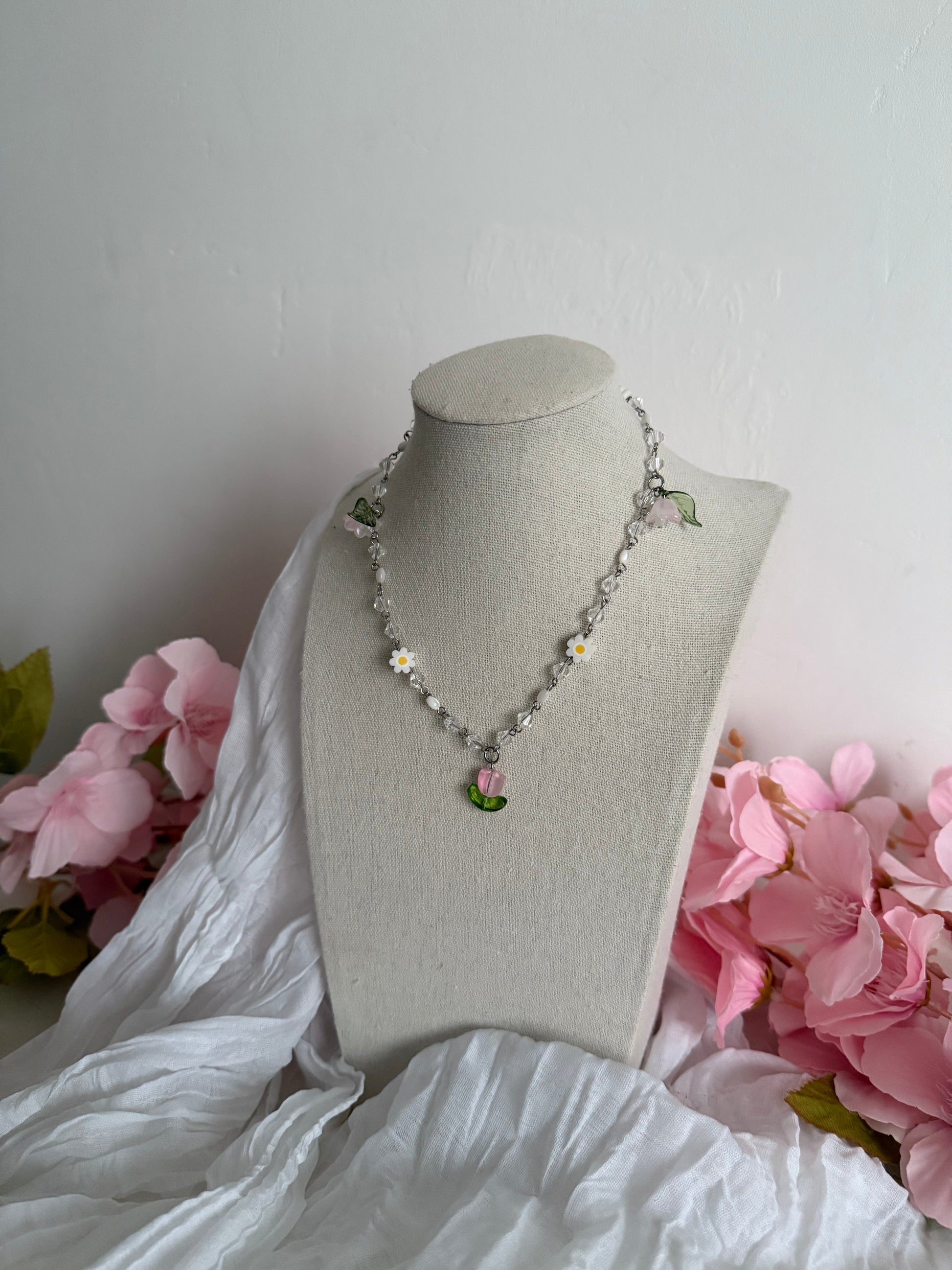Le collier Tulipe mesure 39 cm, sans compter la chaînette d’extension.