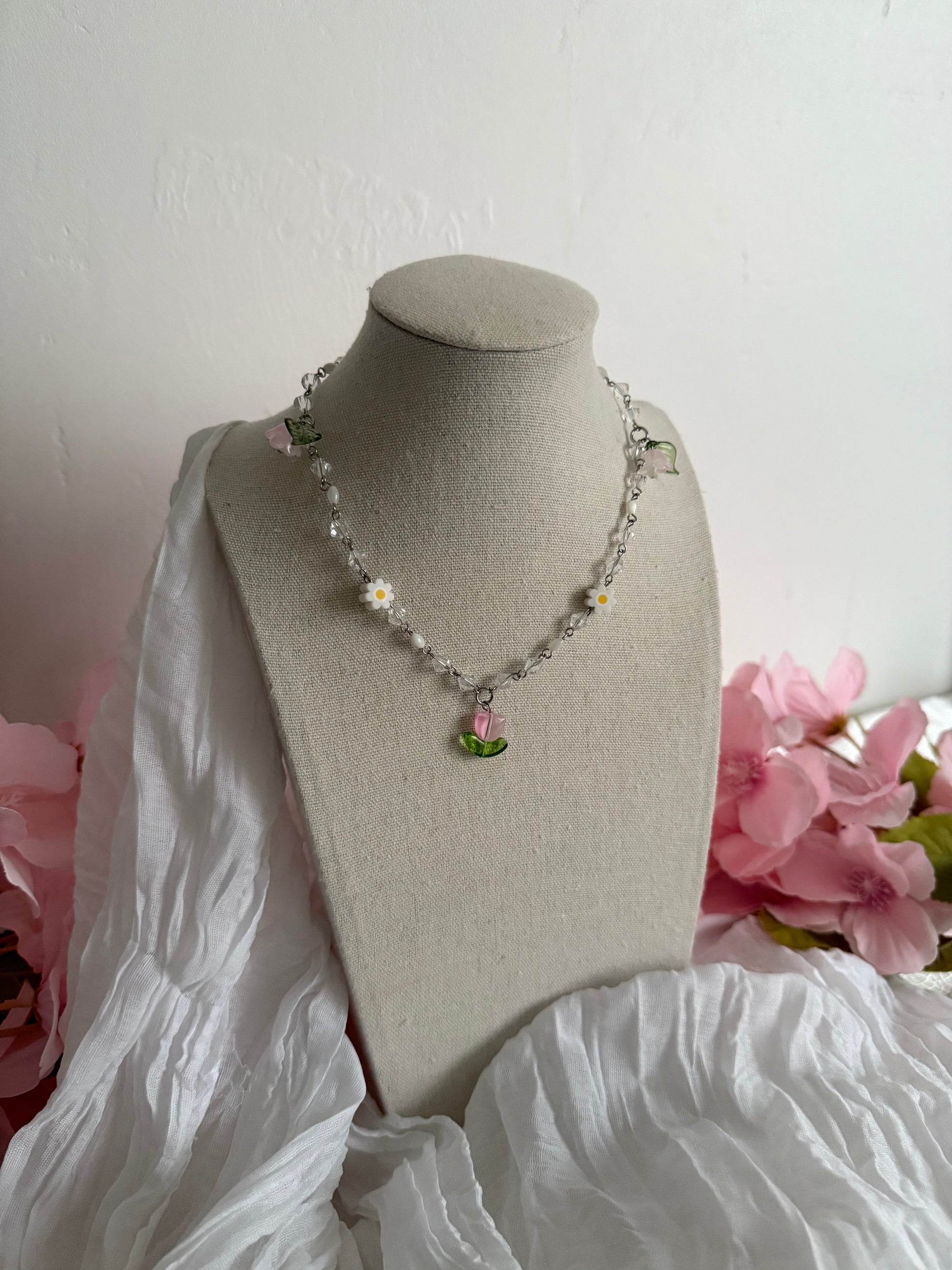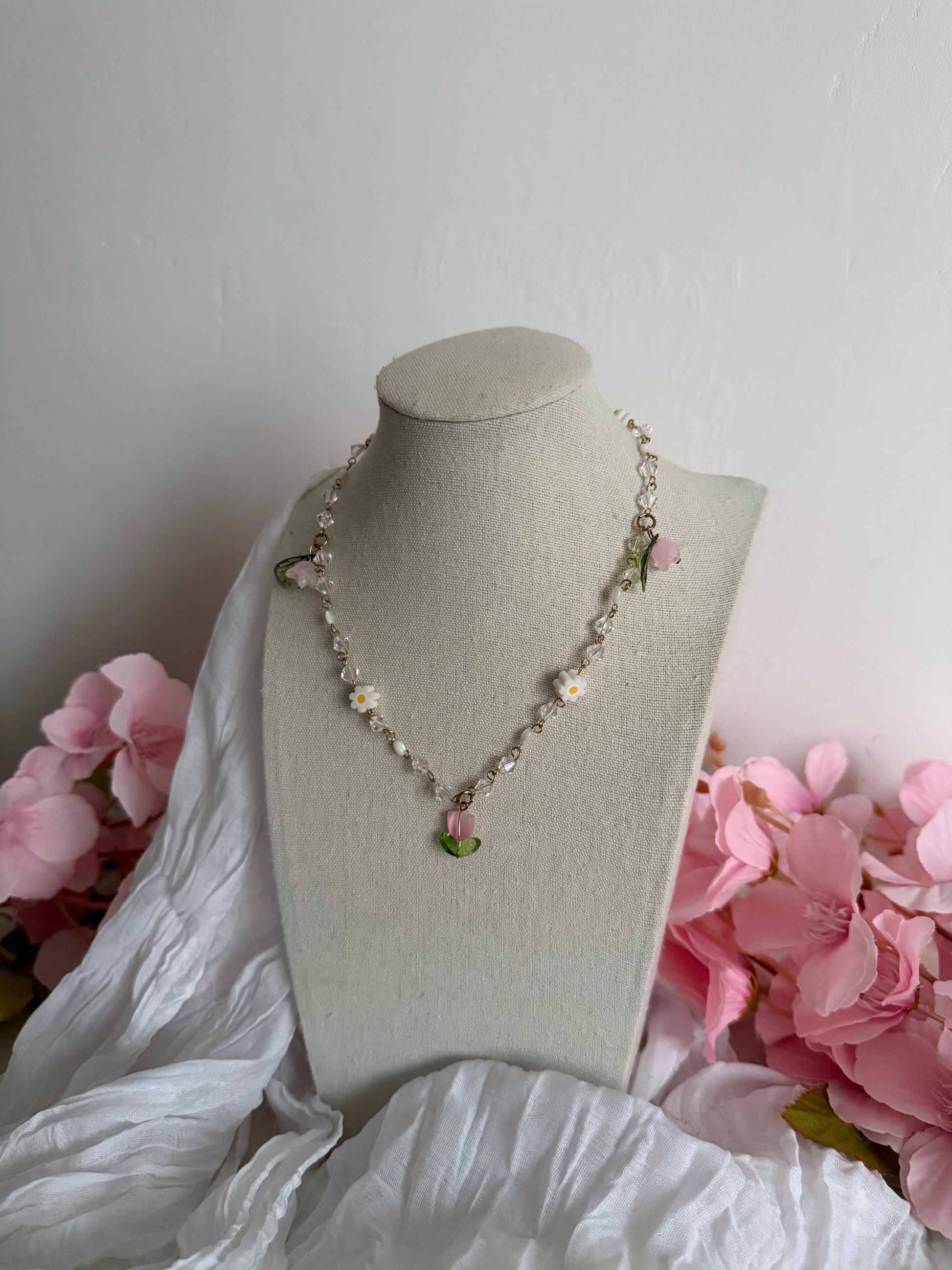 Imaginé dans l’univers du Jardin des Ladies, le collier Tulipe a été entièrement fait main en doré et en argenté dans mon atelier en France.